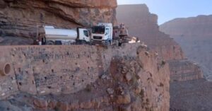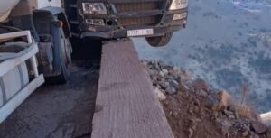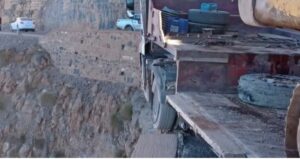 ففي مشهد يحبس الأنفاس، اصطدمت شاحنتان كبيرتان على منحدر خطير، ما أدى إلى انحراف إحداهما نحو حافة الهاوية، وسط صرخات المارة وارتباك السائقين.