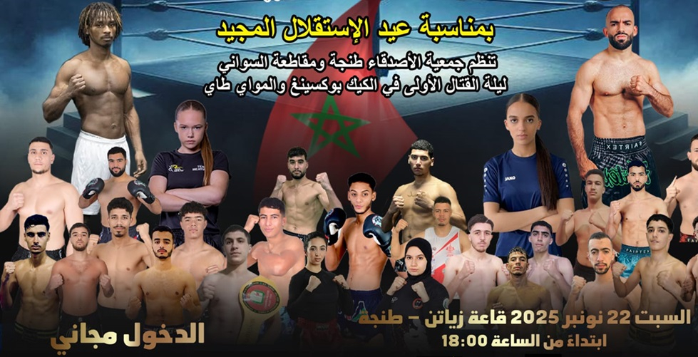 في أجواء احتفالات عيد الاستقلال المجيد، تستعد مدينة طنجة لاحتضان أول نسخة من الدوري الدولي لجمعية أصدقاء طنجة في الكيك بوكسينغ والمواي طاي، تحت شعار: “Fight Night 1 des amis de Tanger”. التظاهرة، التي تنظم بإشراف الجامعة الملكية المغربية لرياضات الكيك بوكسينغ والمواي طاي وبشراكة مع مقاطعة السواني، تعد جمهور فنون القتال بليلةٍ حافلة بالإثارة داخل القاعة المغطاة الزياتن يوم 22 نونبر 2025.